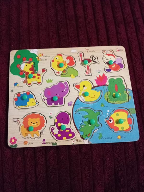 деревянная развивающая игрушка, нужно вставлять изображения животных в подходящей для них дирочки, из недостатков ребенок порисовывал карандашом и на уточке немножко сдерся рисунок, на фото указатель, и другие игрушки, также имеет много детской одежды и обуви, при заказы нескольких скидка