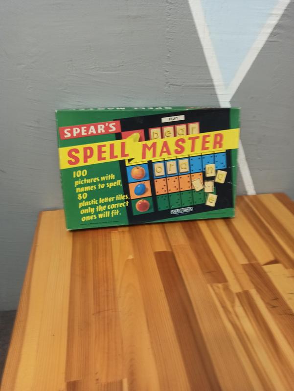обучающая винтажная игра Spear's Spell Master. Это обучающая игрушка, предназначенная для обучения детей точности 100 различных слов. Игра состоит из перфорированной базовой доски, 20 цветных карточек со словами и рисунками, а также 80 пластиковых буквенных плиток. Уникальность игры заключается в том, что только правильные буквы физически подходят к соответствующим местам на карточке, что обеспечивает мгновенную обратную связь.