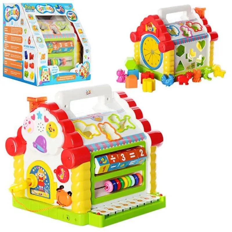Теремок-сортер - многофункциональная развивающая музыкальная игрушка со звуковыми и световыми эффектами. Игрушка способствует развитию у ребенка языка, внимания, логического мышления, музыкального слуха и моторики рук. В процессе игры с помощью сортировки малыш изучит формы предметов, запомнит звуки животных и цвета. Основные функции: Учимся считать. Разноцветные ромбики содержат цифры и математические знаки. Нужно выровнять в один цвет все ромбики. В результате получится математический пример. Спортим фигурки животных. Подбираем и выставляем фигурки в формы-отверстия Теремка. При совпадении фигурки животного с формой звучит его голос. Спортим геометрические фигуры. Подбираем и выставляем фигурки в формы-отверстия теремка. Угадываем форму не глядя. Через окошко, коснитесь рукой любой фигурки, находящейся в теремке. Отгадай не глядя формы фигурки, названия ее. Играем мелодии. Нажимай на клавиши, изучай ноты и играй мелодии. Слушаем веселую музыку. Нажимай на любую музыкальную клавишу и слушай веселые мелодии. Игры: Кто в Теремочке живет? Развивает тактильные ощущения и мелкую моторику рук! Через окошко, коснитесь рукой любой фигурки, и названия ее. Как попасть в Теремку? Подбираем и вставляем фигурки в формы-отверстия Теремка. При совпадении фигурки животного с формой звучит его голос. Достать фигурки с Теремка можно с дверцы: потянуть ключик к дверце и открыть замочек.