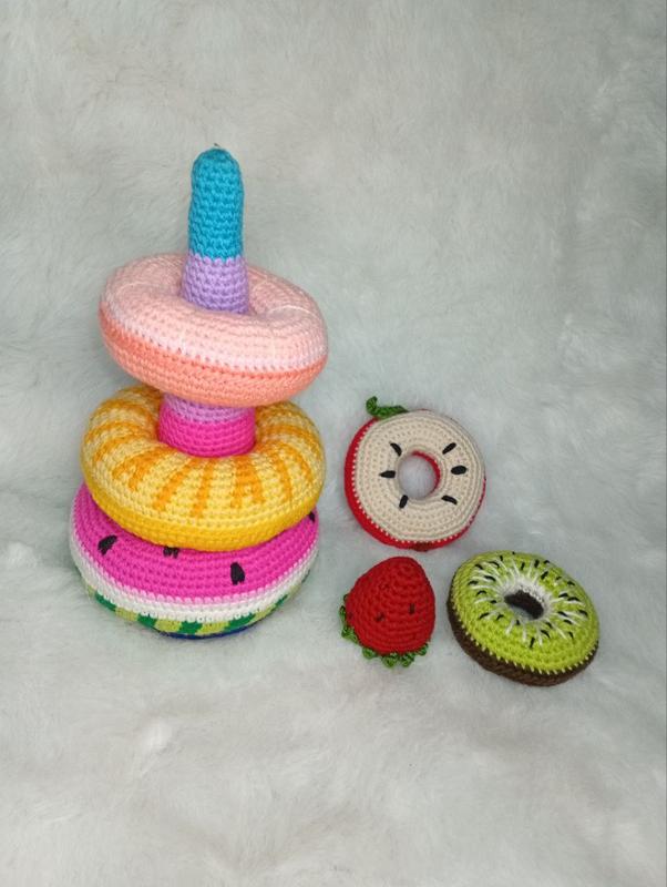 Ручные вязаные игрушки амигуруми: яркие фруктовые пончики, кольца и элементы для развития малышей. Мягкие, безопасные, приятные на ощупь. Подойдут для игры, учебы и подарков. Качественная пряжа, аккуратное исполнение, натуральные цвета.