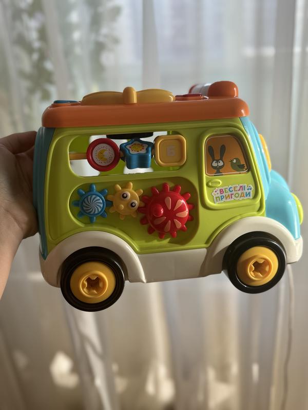 Машинка сортер, музикальна. В комплекті викрутка щоб відкручувати колеса. Нюанс- не вистачає однієї фігурки