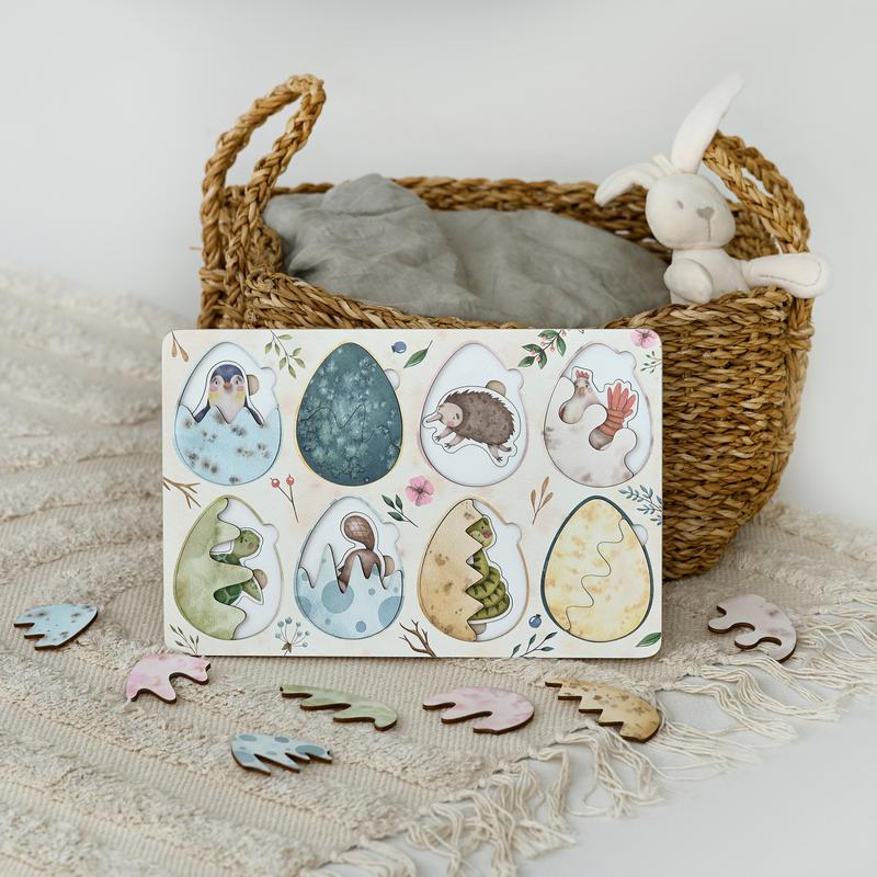 Какие животные появляются из яйца? Что это птицы и пресмыкающиеся вы точно знаете. Знаете ли вы, что существуют еще и яйцекладные млекопитающие. Это утконос и ехидна. Расскажите об этом своим детям с помощью сортера Кто появляется из яйца. Пазл содержит 8 яиц, в которых «прячутся» пингвин, крокодил, ехидна, курица, черепаха, утконос, змея и страус. Рисунки на элементах пазла уникальны и выполнены акварельными красками детским иллюстратором. Они вызывают любопытство у детей и дарят эмоциональное удовольствие во время игры, при этом реалистичность животных передана максимально. Каждое яйцо имеет разную линию разреза и цвет, чтобы играть с ним ребенку было еще интереснее. - Размер: 29 х 19 см. - Изготовлен из березовой фанеры - прочного и безопасного материала. - Окрашен безопасными красками на водной основе. - Пазл развивает сенсорные ощущения и мелкую моторику ручек. - Отличный учебный материал для развивающих занятий по методике М. Монтессори - Можно играть деткам с 3-х лет. Деревянные игрушки - это не просто модный тренд. Это целая философия воспитания и заботы. Окружайте своих деток только качественными, эстетически красивыми и полезными игрушками.