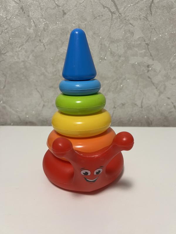 Виготовлена у формі кумедного равлика з усмішкою та вушками. Складається з основи, стрижня, п'яти різнокольорових кілець та конусоподібного наконечника. Кільця мають обтічну форму, гладкі та приємні на дотик, безпечні для малюків. Сприяє розвитку дрібної моторики, координації рухів, уваги, пам'яті та логічного мислення. Підходить для дітей віком від 1 року.