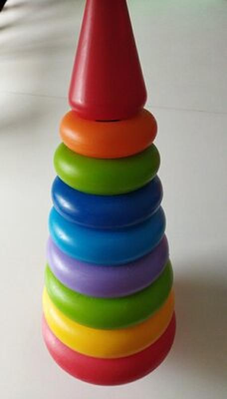 Высота 43см., ширина по низу-19см. Пирамидка с крупными колышками. Состояние хорошее, потертости. Пластик прочный.