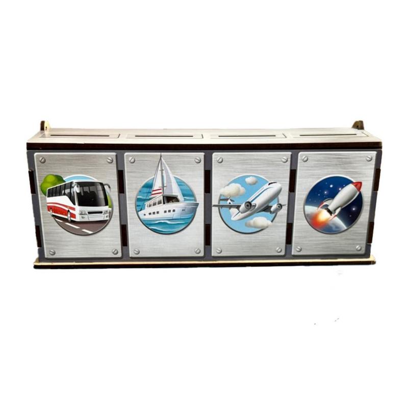 4 тематических ящика с различными видами транспорта: водный, сухопутный, воздушный и космический. В наборе идет 40 плашек с реалистичными рисунками для сортировки и 4 карты для игры в лото. Ребенку нужно разложить весь транспорт ассоциациями: автобус – это наземный вид транспорта, а корабль – водный и т. д. Второй вариант игры: выкладывайте по 3 плашки с тематикой, например, воздушного транспорта, а 4 с поездом и просите ребенка найти лишнюю плашку в этой цепочке. Рассмотрите все фишки вместе с ребёнком. Назовите транспорт, изображенный на фишках. Предложите крохе спрятать все фишки в домики, опуская в отверстия коробки-сортера. Игра "Лото для малышей". Возьмите одну карту и подберите фишки заранее. Рассмотрите и назовите все изображения на фишках и на карточках вместе с ребенком. Вы можете разнообразить игру, спрятав фишки в мешочек. Попросите ребенка вытаскивать из мешочка по одной фишке и находить такую же картинку (домик фишки) на карточке. Еще один вариант игры для малышей: выкладываете по 3 плашки с тематикой, например, водный транспорт, а 4 с самолетом и просите ребенка найти лишнюю плашку в этой цепочке. Игра "Лото". Рассмотрите и назовите изображение на картах. Фишки разложите на столе изображение вниз. Карты распределите между игроками (можно выбрать). Выбирается ведущий, который будет открывать по одной фишке и называть изображенную на ней картину. Игра "Две руки". Выложите перед ребенком фишки с изображениями, относящимися только к двум видам транспорта. Попросите ребенка собирать и бросать фишки в коробку-сортер двумя руками (правой рукой можно собирать только водный, а левой – только наземный). Старшим детям можно предложить вариант игры на время. Викторина. Пополняйте знания ребенка интересными фактами о разных видах транспорта. Предложите ему сыграть в викторину, в которой вы будете задавать вопросы, а ребенок – давать на них ответы.