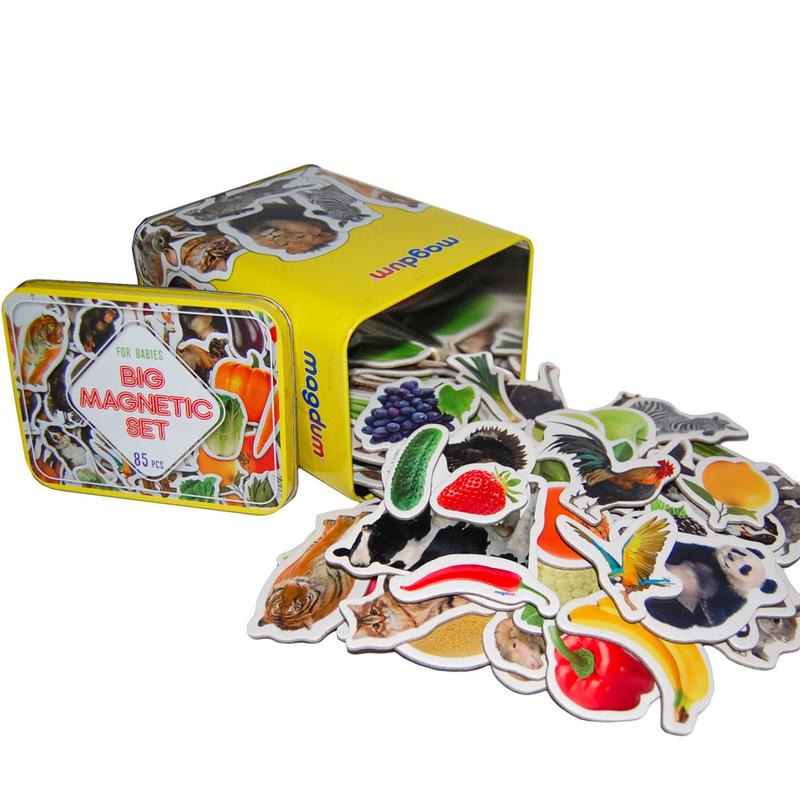 Тварини ферми і зоопарку, овочі, фрукти і ягоди - всі ці магніти в одній коробці! З ними можна грати нескінченно! Грай, вивчай, порівнюй, групуються, вигадуй історії, вважай! У металевій коробці ви знайдете 85 великих, міцних, зручних магнітів. Кожне зображення - реальне фото. З магнітами можна грати скрізь: на холодильнику або магнітної дошці, на підлозі або столі. Кращий подарунок для дитини - корисний і цікавий.