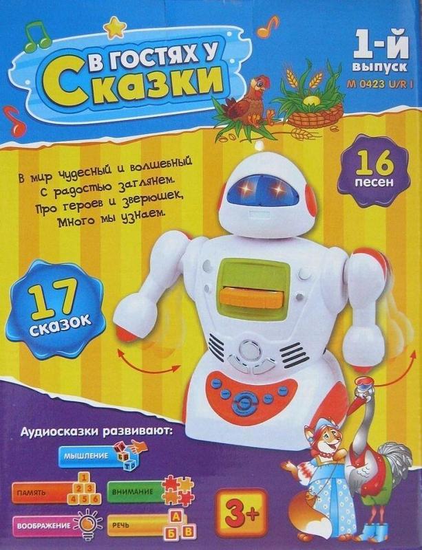 Игра - робот «В гостях у Сказки» + наклейки, раскраски №1(1-й выпуск) Замечательная игра-робот В гостях у Сказки входит в серию фонографических игр. Оригинальный робот будет помогать Вашему малышу в обучении. С помощью такой развивающей игрушки Ваш малыш услышит множество сказочек и песенок , что поможет развить воображение и музыкальный слух. 17 сказок и 16 песен Сказки: 1. Золушка 2. Колобок 3. Каша из топора 4. Петух и бобовое зёрнышко 5. Кот в сапогах 6. Красная шапочка 7. Курочка Ряба 8. Лиса и Козёл 9. Лиса и Журавель 10. Маша и медведь 11. Репка 12. Спящая красавица 13. Теремок 14. Три медведя 15. Волк и семеро козлят 16. Заюшкина избушка 17. Цапля и Журавель Песни: 1. Песня волка и козлят 2. Два весёлых гуся 3. Наш красавец самовар 4. Песня про чибиса 5. Песенка рыжехвостенькой 6. Прилетели восемь галок 7. В траве сидел кузнечик 8. Песня короля и принцессы 9. Небылица 10. Песня кота в сапогах 11. Песня Красной Шапочки 12. Спи, моя радость, усни 13. Картины 14. Пер-скрипач 15. Спящая красавица 16.Тема Красной Шапочки Рекомендуется для детей от года. Работа происходит от трех батареек АА(в комплект не входят) Размеры игрушки: 410х270х130 мм. Производитель: Joy Toy