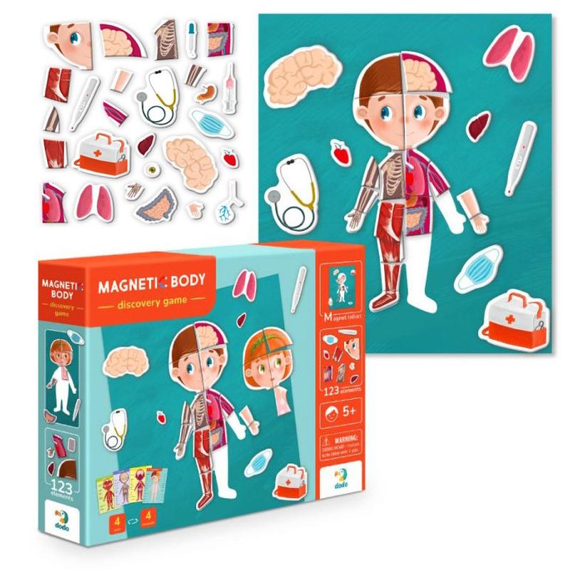 Магнитная развивающая игра, с помощью которой ребёнок может получить первые познания в строении человеческого тела. В набор входит: - Магнитная доска 36х28 см. - 123 магнитных элемента - 4 карты с заданиями на 4 языках (украинском, русском, английском и польском) Размер упаковки: 38x30x7 см.
