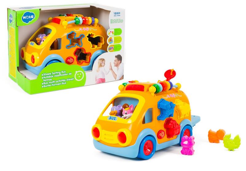 Детская игрушка-сортёр в форме автобуса, с багажником на замке, счётами на крыше и фигурками-погремушками, которые издают звук животного при попадании на своё место. Автобус умеет самостоятельно ездить, во время чего светятся фары, играет музыка и животные на водительских местах -- танцуют.