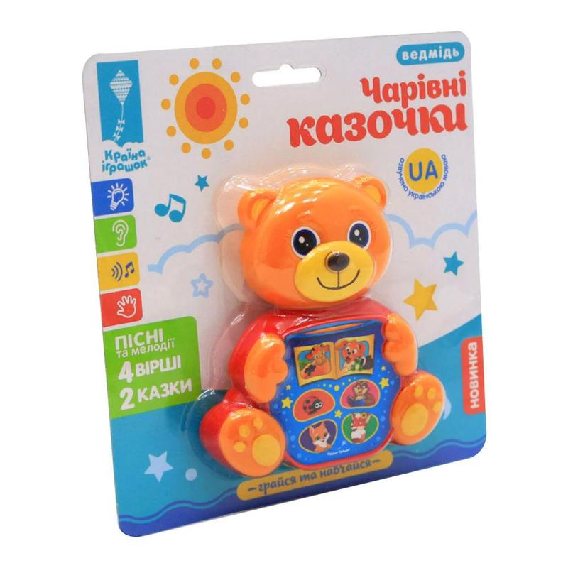 Іграшка включає чотири вірша і дві казочки. Розвиває у дитини візуальне сприйняття, дрібну моторику, логічне мислення та слухове сприйняття. Озвучення українською мовою. "Музичний ведмедик з чарівними казочками розроблений за участю професійних методистів і дитячих психологів, на основі програми розвитку дитини дошкільного віку. характеристики: 2 казки; 4 вірша; 2 мелодії; 1 пісня. Розвиває: дрібну моторику, координацію рухів, музичний слух, почуття ритму, пам'ять і фантазію. Розмір іграшки: 12 * 13 * 3 см. Озвучена українською мовою. Розмір упаковки: 19 * 20 * 3 см