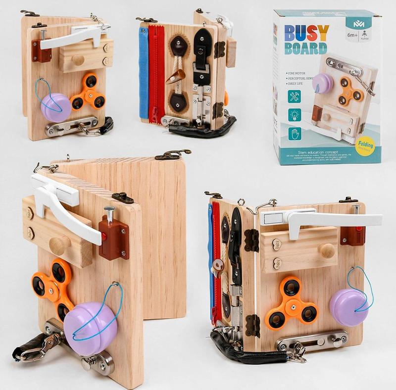 Розвиваюча гра дерев'яний бізіборд С 49415 відмінно підійде для найменших і допоможе малюкам пізнавати цей світ! Особливості: - виконана із сертифікованих якісних матеріалів: дерево, пластик, метал; - іграшка, яка допоможе дитині розвивати дрібну моторику, логічне мислення та фантазію; - гра зроблена у формі книги, яку можна поставити або покласти у закритому варіанті; - на дерев'яні дошки з двох сторін розташовані захоплюючі елементи: 1. Спінер 2. Засувка 3. Ручка від вікна 4. Дверний ланцюжок 5. Гудзик на мотузку 6. Блискавка 7. Дверна клямка 8. Липучка 9. Кнопка з ремінцем - по краях дошки зроблені гачки, які фіксують дошку в стоячому положенні. Бізіборд допомагає розвивати одночасно дрібну моторику, а також логічне мислення. Що може бути краще?