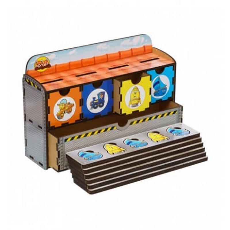 Комод состоит из 4 тематических ящиков для сортировки вкладышей по цвету, рисунку и 1 ящика, где находятся планки для укладки. В наборе 6 планок и 30 фигур сортировочного транспорта.