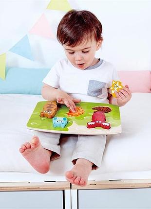 Тактильна рамка-вкладиш Hape Лісові звірята підходить для дітей віком від 2 років. Це чудова розвивальна іграшка, яка не лише знайомить із жителями лісу, але і дає можливість їх «погладити». Щоб дізнатися, який приблизно на дотик їжачок, сова, лисиця, ведмідь і лось, запропонуйте дитині витягнути елементи пазла і доторкнутися до матеріалів, що всередині виїмок. Гра з пазлом розвиває тактильні відчуття малюка, а також знайомить із тваринами. • Пазл зручно тримати маленькими ручками. • Деталі виконані у вигляді веселих звірят. • Основа містить різні на дотик матеріали. • Усі елементи є безпечними для здоров'я. • Матеріал: деревина, текстиль. • Розміри: 21 х 29 х 3 см. • Рекомендовано для дітей віком від 2 років.