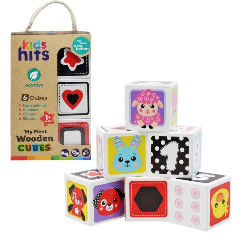 Набор из 6-ти деревянных кубиков "My first wooden cubes". На разных сторонах кубиков изображены зверушки, числа, разные цвета и формы, что позволит обучить ребенка множеству новых навыков. Кубики выполнены из экологически чистых материалов, постностью безопасны для ребенка. Размер одного кубика: 6х6х6 см.__ Бренд: Kids hits Упаковка: Коробка Цвет: Разноцвет Вес в упаковке: 720 г Габариты в упаковке: 7 x 12.5 x 19 см Габариты без упаковки: 6 x 6 x 6 см Cтрана производитель: Китай Материал: Дерево Комплектация: 6 кубиков