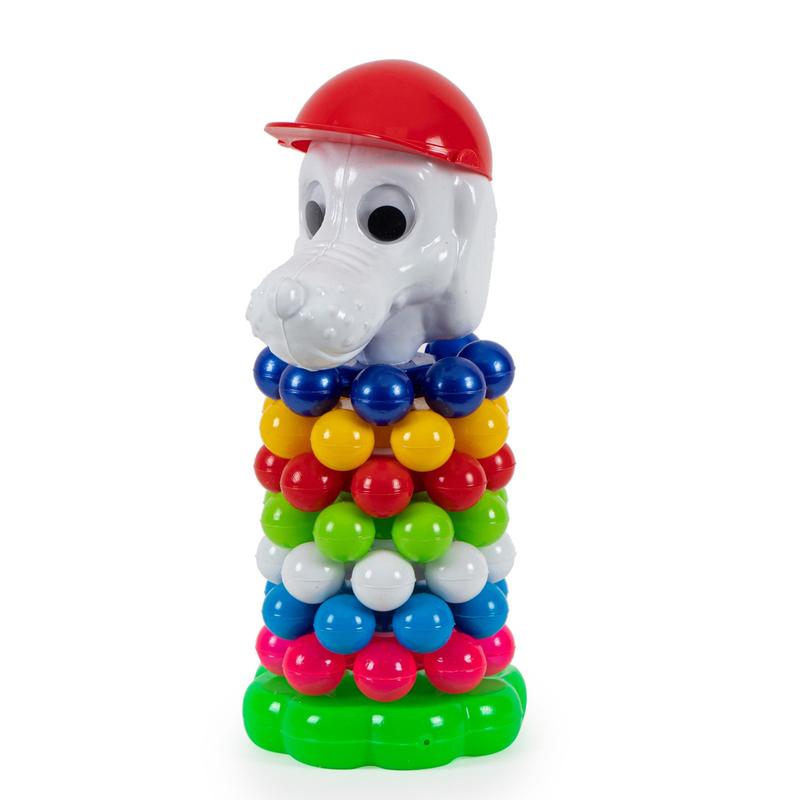 Детская игрушка – пирамидка “Шарик (собачка)” состоит из: основы – 1 шт., кольца – 7 шт., верхушка-голова – 1 шт. Основные элементы игрушки: Голова собаки: верхняя часть игрушки является головой белой собаки с большими черными глазами.