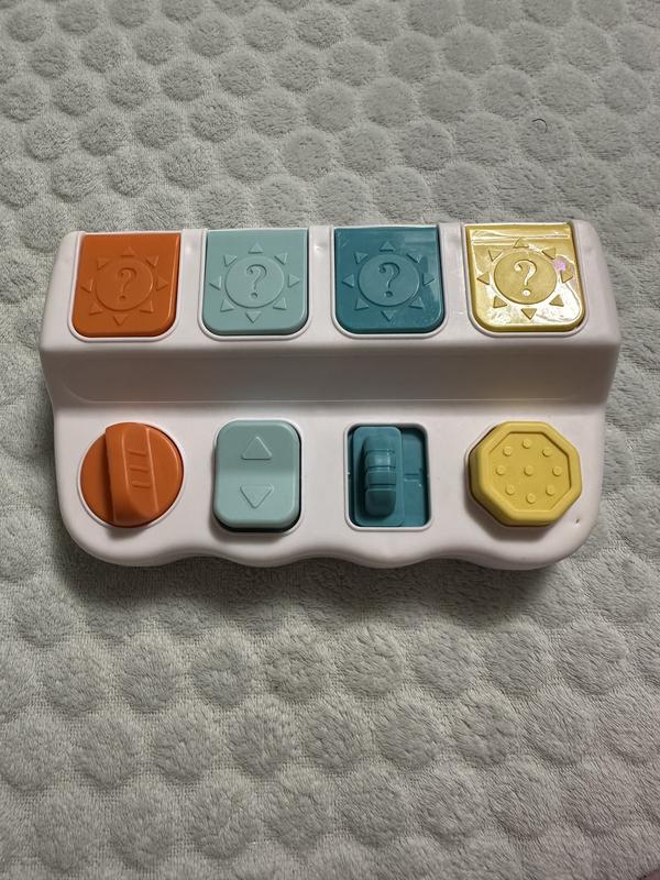 Розвиваюча іграшка для малят, з віконцями, що відкриваються при натисканні на кнопку, повороті чи пересуванні та з них вистрибують звірята.