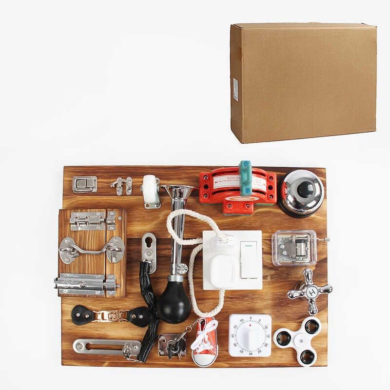 Развивающий бизиборд для малышей Раннее развитие ребенка - это ключевой этап в его жизни. Именно в этот период формируются основы знаний о окружающем мире, тактильные ощущения и навыки мелкой моторики. Предлагаем вам уникальный бизиборд, который станет отличным решением для родителей, стремящихся сделать обучение своего ребенка легким и интересным. Эта игрушка изготовлена из экологически чистых и безопасных материалов, что гарантирует безопасность вашего малыша во время игры. Благодаря бизиборду, ребенок научится завязывать шнурки, а также расстегивать и застегивать молнии, что значительно облегчит процесс самостоятельного одевания в будущем. Бизиборд имеет шесть различных видов замков, которые помогут ребенку понять принцип работы простых замков, а также содержит розетку, на примере которой можно объяснить основы безопасности при использовании электрических приборов. Основные особенности: - Устойчивая деревянная основа; - Восемь разновидностей застежек и замочков; - Таймер, который звенит, когда время истекает; - Фиджет и вращающееся колесико; - Розетка с вилками; - Гудок и звонок для веселья; - Музыкальная шкатулка, которая играет мелодии.