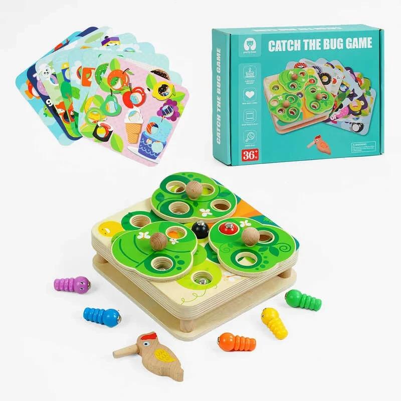 Очаровательная логическая игра для маленьких натуралистов Приглашаем вас в захватывающий мир рыбалки с игрой "Охота на червячков". В этой динамичной игре вам предстоит ловить разноцветных червячков с основной платформы с помощью магнитной птички-удочки. Это не только весело, но и полезно! - Игра развивает ловкость рук и координацию движений. - Помогает малышам различать оттенки цветов. - Сразитесь с друзьями в увлекательном соревновании! Время для игры ограничено, так что будьте быстрыми! Победителем станет тот, кто успеет поймать больше червячков за отведенное время. Особенности игры: - Экологичные и безопасные материалы; - Яркие, привлекательные цвета; - Платформа с отверстиями для ловли; - Три деревянные платформы для дополнительных вызовов; - 10 магнитных червячков разных цветов; - Деревянная птичка-удочка для захватывающих моментов; - 8 карточек для изменения игрового поля.