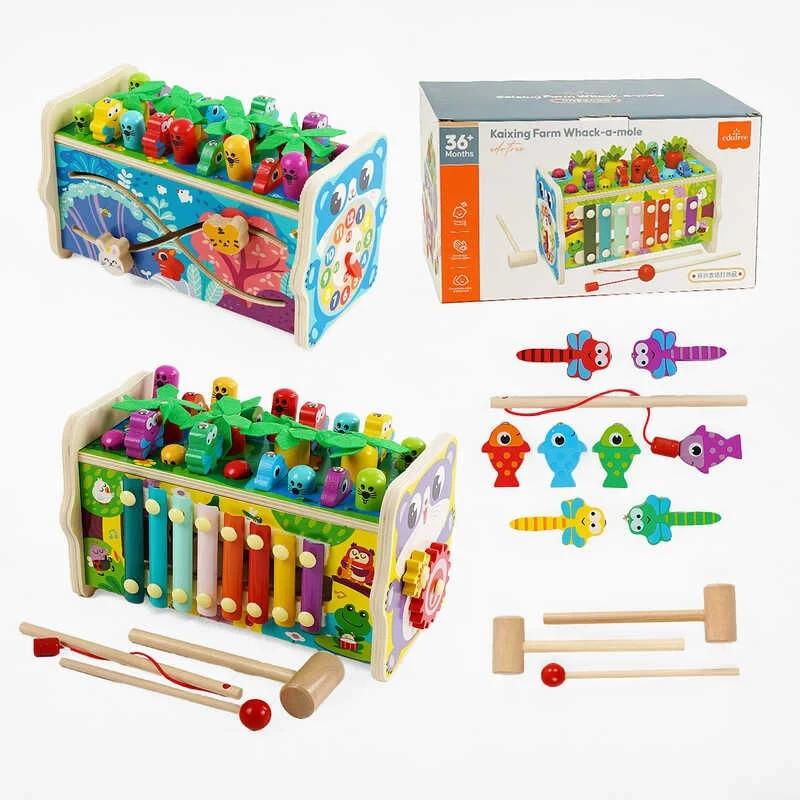 Логический игровой центр "Веселое развитие" Этот замечательный игровой центр объединяет сразу пять увлекательных игр, которые помогут вашему ребенку развивать логическое мышление и моторику. Каждая из панелей предлагает уникальный опыт: - Игра-стучалка, которая развивает координацию движений; - Магнитная рыбалка, обучающая терпению и ловкости; - Вынимание морковок из импровизированной грядки для развития мелкой моторики; - Игра на цветном ксилофоне, знакомящая с музыкальными звуками; - Перемещение животных по заданному маршруту для развития пространственного воображения. Центр также включает движущиеся шестеренки, которые станут любимой забавой малыша. В комплект входят два молотка, палочка для игры на ксилофоне и магнитная удочка. Все элементы безопасны, а округлые края предотвращают травмы. Размеры игрушки: 24х15х14,5 см.