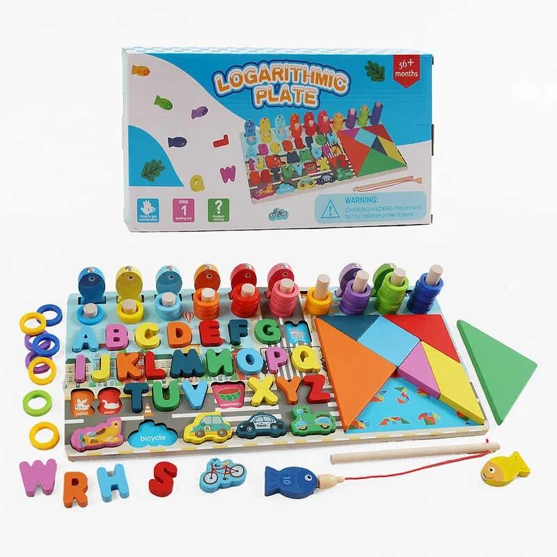 Развивающая деревянная логическая доска F 43632 Этот многофункциональный набор создан для комплексного развития детей от 3 лет. В одной доске объединены несколько обучающих игр: магнитная рыбалка, изучение английского алфавита, сортировка цветов, форм и элементов транспорта. Игрушка помогает развивать логику, моторику, координацию и память в увлекательной игровой форме. - Изучение английского алфавита с яркими буквами - Магнитная рыбалка для развития внимания и моторики - Колышки и кольца для активной игры - Знакомство с цветами и геометрическими формами - Элементы транспорта для сортировки и обучения - Деревянный сортер и фигуры для конструирования - Рекомендовано для детей от 3 лет