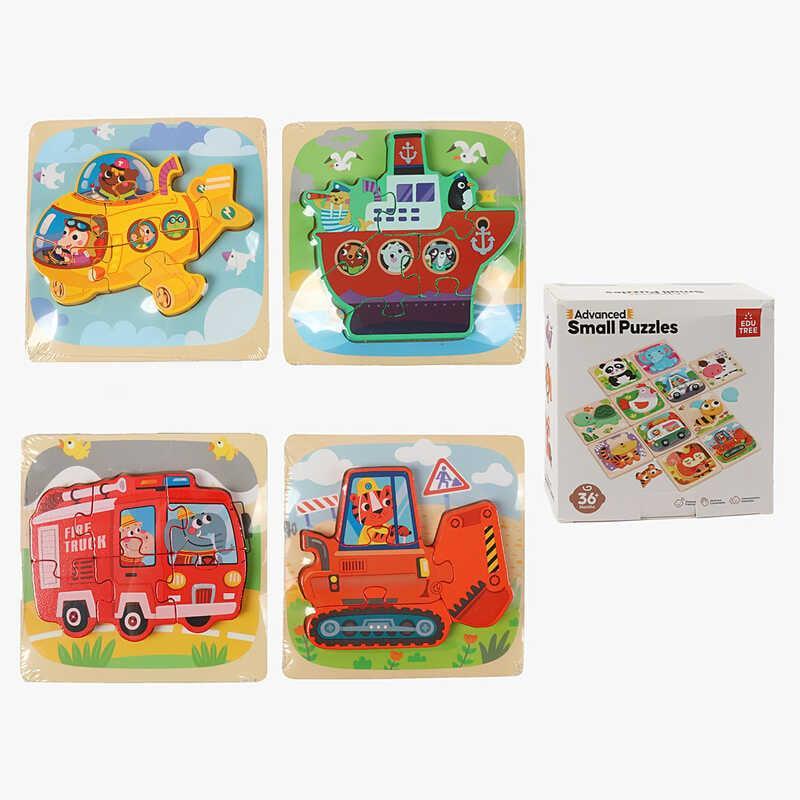 Развивающие деревянные пазлы-вкладыши C 74360 Эти яркие деревянные пазлы-вкладыши идеально подходят для развития логического мышления и мелкой моторики у детей. Каждый пазл состоит из четырёх крупных деталей с красочными изображениями различных транспортных средств, что делает игру интересной и познавательной. - Материал: натуральное дерево - Размер деталей оптимален для маленьких рук - Яркие и контрастные рисунки - Развивает внимание, координацию и воображение