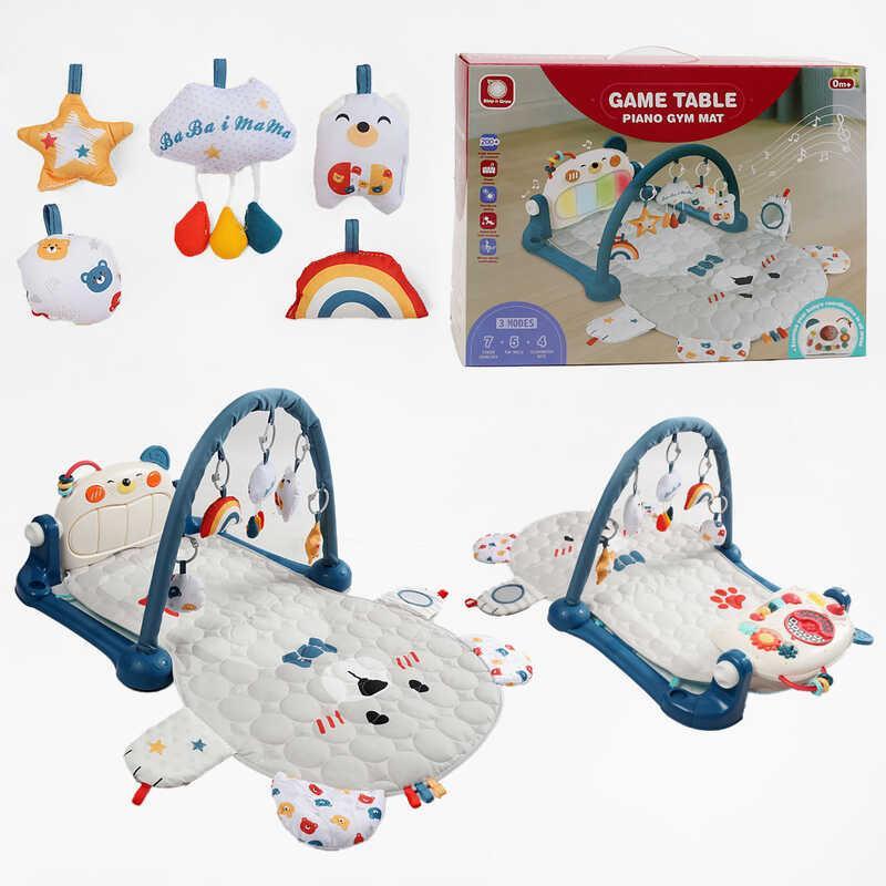 Интерактивный развивающий коврик для малышей HX 9158 A Этот яркий детский коврик оборудован дугой с пятью подвесными погремушками, интерактивным пианино-бизибордом, подсветкой и звуками. Он помогает развивать моторику, слух и координацию у малышей. - Размер: 99х61 см - Высота дуги: 45 см - Подвесные игрушки: погремушки, пианино, шестеренки, кольца, геометрические фигуры - Интерактивные звуки и подсветка - Безопасные материалы для детей