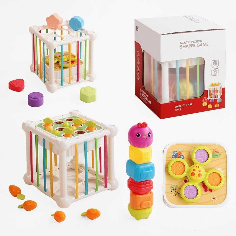 Развивающий логический куб для малышей Уникальный куб YL 1303 DA способствует развитию сенсорики, слуха, зрения и мелкой моторики рук у детей. Каждая грань куба оснащена эластичными решетками, через которые ребенок может продвигать игровые элементы, изучать их и собирать пирамидку. Игрушка выполнена из прочного пластика и имеет приятное цветовое оформление. Основные характеристики - Форма куба с эластичными решетками - Включает 5 различных игровых элементов: морковная грядка, стучалка, спиннер, геометрический сортер, пирамидка - Элементы пирамидки имеют звонкие вставки внутри - Развивает сенсорное, слуховое и зрительное восприятие - Способствует развитию логического мышления и моторики рук