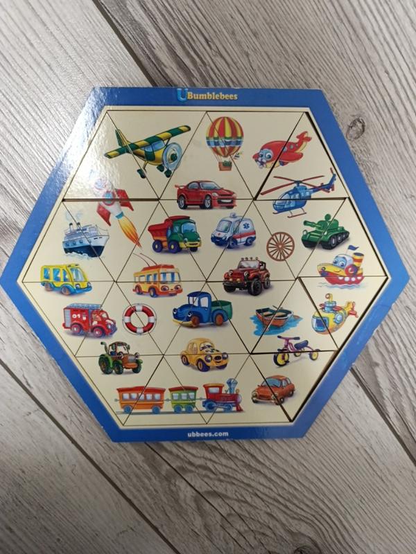 розвиваючий пазл на тему Транспорт, пазли у вигляді трикутників, збирається у форму шестикутника