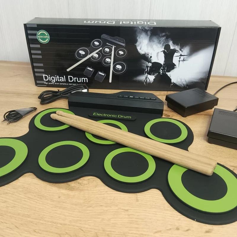 Гнучкі електронні барабани -- сучасний музичний інструмент, який дозволяє насолоджуватися грою на барабанах будь-де та будь-коли. Виготовлені з високоякісного еластичного матеріалу, вони легко складаються та транспортуються, що робить їх ідеальним вибором для музикантів, які ведуть активний спосіб життя. Підключення через USB забезпечує простоту використання та сумісність із різними пристроями: комп'ютерами, ноутбуками та планшетами. Переваги: - Компактність і мобільність - Інтуїтивно зрозуміле управління - Багатофункціональність - Стильний зовнішній вигляд - Приваблива ціна Характеристики: - Матеріал: екологічний силікогель + пластик - Розмір: 43 × 28 × 2,7 см - Джерело живлення: 5 В постійного струму - Вхідна потужність: 2,5 Вт - Вихідна потужність: 2 Вт - Тип ударних/тон: рок, латиноамериканський, електронний, ударний - Демонстраційні пісні: heavy rock, funk, Latin, samba, cha-cha, swing, rock and roll та ін. - Живлення: USB або 2 × AAA батарейки (не входять у комплект)