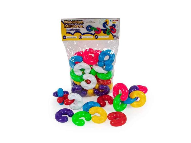 Игрушка детская “Цветная цепочка No2” (14 элементов) – состоит из множества разноцветных пластиковых звеньев в виде полуколец. Эти элементы можно сочетать друг с другом, создавая разные формы и конструкции. Эта игрушка помогает развивать мелкую моторику, креативное мышление и координацию у детей, а также служит хорошим способом для игр с построенной конструкций. Размер детали - 20*20*6 см. Вес 140 г