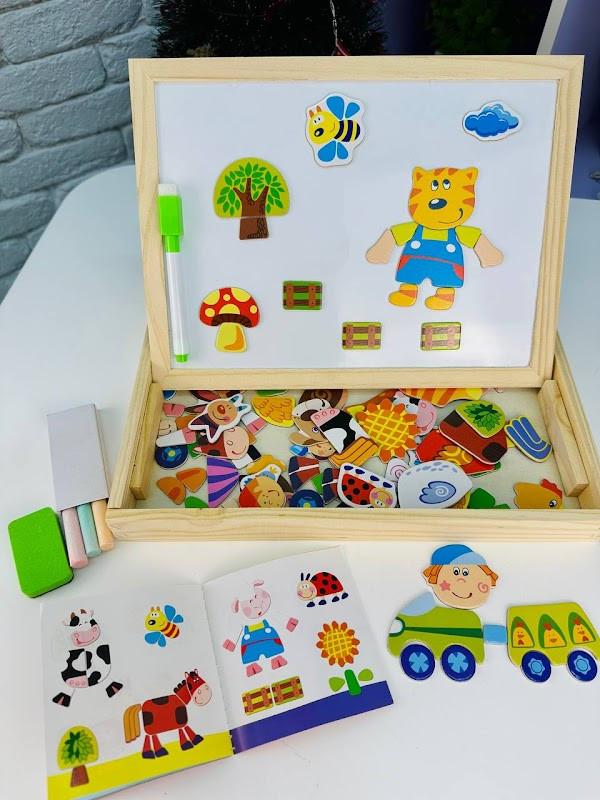 1903 Деревянный-двусторонний чемоданчик с магнитами в виде мольберта С одной стороны можно писать мелом, вторая сторона магнитная-для рисования водным маркером и сборки картинок Развивает мелкую моторику. Логическое мышление. Фантазию. Творческие способности Вашего малыша Комплектация: Набор магнитных пазлов Маркер с губкой Крейда Книжка с примерами Размер: 31х24х3см