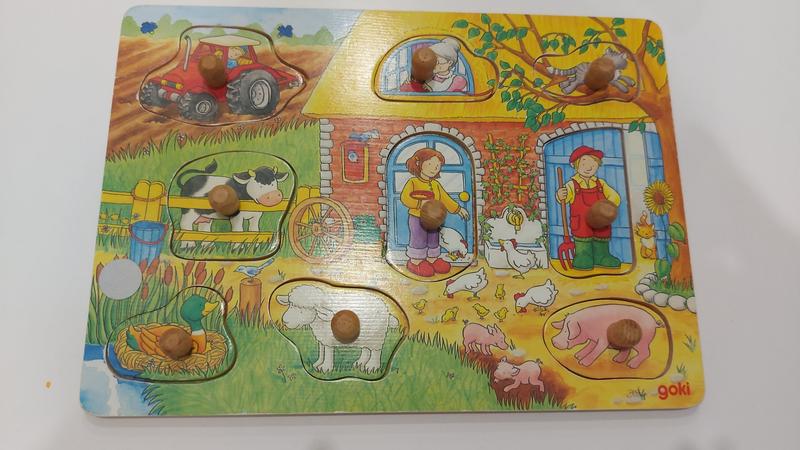 Яркий пазл с изображением фермерского хозяйства ознакомит ребенка с разными домашними животными. Деревянный пазл в виде доски с девятью вкладышами. Если поднять вкладыш, можно увидеть «прикрытое». Интерактив, развивающие игры с пазлом goki гарантированы. Пазл изготовлен из натуральной древесины; она гладко отшлифована и качественно обработана. Изображение нанесено нетоксичными красками на водной основе. Размеры доски-основы – 30х21 см.