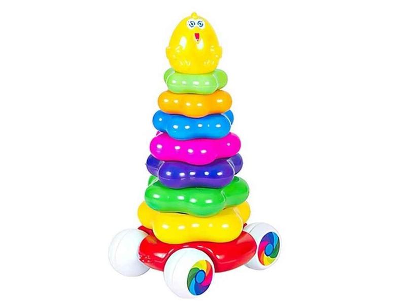 Іграшка дитяча “Піраміда Каталочка” – яскрава дитяча пірамідка, доповнена елементами для гри на коліщатках. Основа іграшки – це колісна платформа з білими колесами, прикрашеними різнокольоровими спіралеподібними візерунками. На пірамідці розташовані кільця незвичайної форми (вони хвилясті, а не круглі), пофарбовані в різні кольори: зелений, фіолетовий, рожевий, синій, жовтий та інші. На вершині пірамідки розміщена фігурка курчати яскраво-жовтого кольору із кумедними очима. Ця іграшка також сприяє розвитку моторики, координації та логічного мислення у дітей. Вага: 270 г Розмір: 30 x 15 x 12,5 см