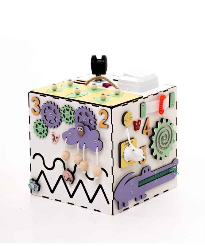 Комплектация бизикубика 23х23х23 ● Сортер с геометрическими фигурами ● Божья коровка с блестками ● Вимикач ● Колесо велике ● Счеты ● Часы ● Механизм с шестернями и ракеткой ● Липучка ● Ботинок со шнуровкой ● Крутилька на ассоциации ● Вилка ● Розетка ● Крокодил с молнией ● Резинки ● Лабиринт-шестерня с бисером ● Шестеренки ● Облачко с шариками ● Лабиринты ● Разноцветные цифры