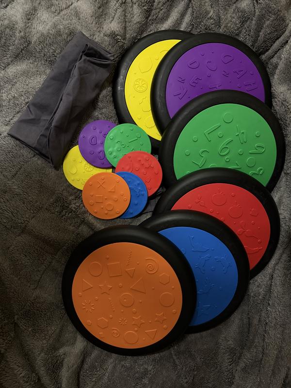 Набір сенсорних дисків Розміри: великий диск – діаметр 27 см маленький диск – діаметр 13 см Матеріал: пластик Сенсорні тактильні диски з різною поверхнею нагадують масажні килимки. З ними можна грати в різні ігри, будувати доріжки, розкладати вдома в прохідних місцях для профілактики плоскостопості. Ігри та заняття з сенсорними дисками сприяють фізичному розвитку дитини, розвитку тактильних відчуттів, уваги, тренують м'язи ніг, вчать тримати рівновагу та координувати рухи. Застосування: сенсорні диски підійдуть для спортзалів шкіл, дитячих садків, розвиваючих центрів, кабінетів ЛФК, реабілітаційних центрів, сенсорних кімнат і для домашнього використання