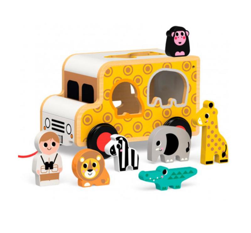 Включає вантажівку та 7 сортувальних елементів. Виготовлена з високоякісної деревини з використанням фарби на водній основі. Призначена для розвитку логічного мислення, дрібної моторики та сенсорних здібностей. Має рухомі колеса та задні дверцята, що відчиняються.