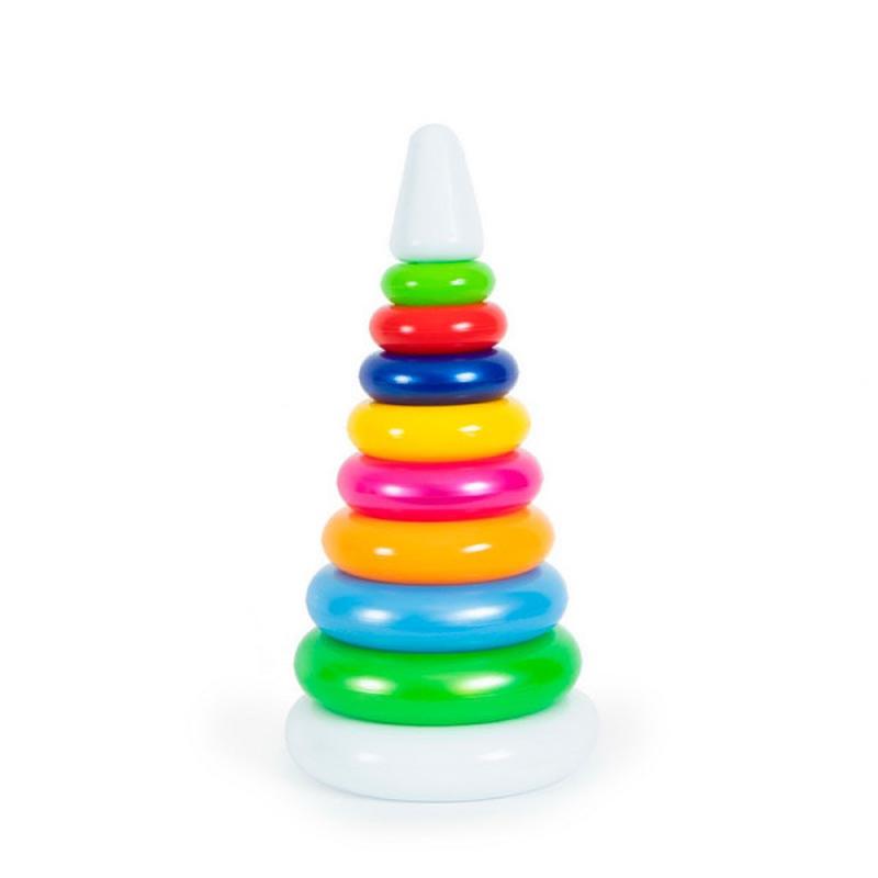 Яркая пластиковая пирамидка. Состоит из основания, 8 разноцветных колец и верхушки. Классическая детская игрушка, которая поможет малышу научиться считать, изучить цвет и развить мелкую моторику рук.