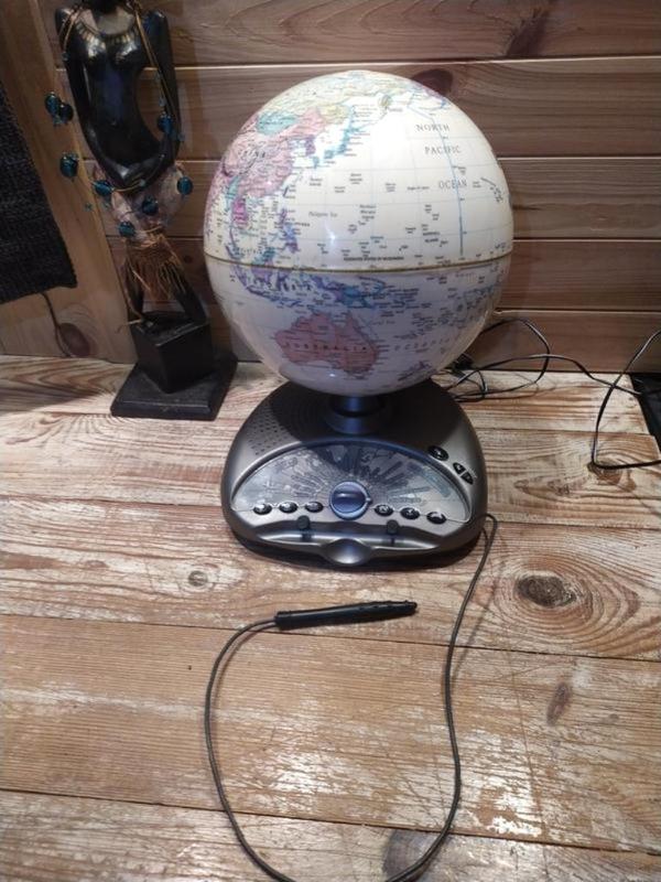 Интерактивный глобус ODYSSEY III. Очень интересній игровой и познавательній девайс. Этот образовательный продукт предназначен для детей в возрасте от 5 лет и старше, хотя будет интересн даже взрослым. Глобус позволяет изучать географию и факты о мире. Также пргодится для изучения и закрепления английского языка. Он оснащен специальной ручкой-стилусом, с помощью которой можно нажимать на различные места на глобусе, чтобы получить информацию о странах, столицах, населении и других данных. Содержит различные режимы, такие как сравнение, игры и поиск. Язык - английский. Работает от блока питания на 220 вольт. Есть и отсек для батареек, но он неисправен.