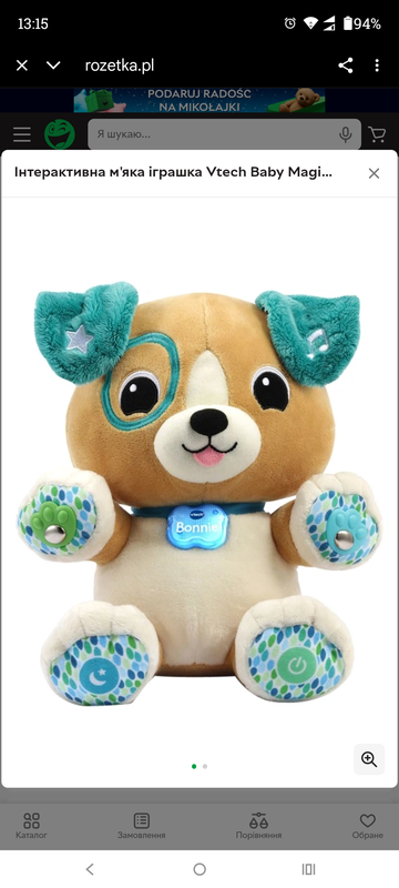 интерактивная развивающая игрушка VTech "Щенок, разговаривающий". На нижних лапах расположены интерактивные кнопки ( вкл-выкл, мелодии для сна), ушки (говорятся, песенки), верхние лапки тоже реагируют, кнопка на ошейнике светится! Собака Magic Paw отлично подходит для объятий, и когда вы нажимаете на его лапы или уши, все становится захватывающим: тогда он поет веселые песни и поощряет вас подпевать. Вы можете управлять ним, касаясь и отпуская его лапы. Есть интерактивный режим, в котором собака разговаривает и поощряет к игре, и режим перед сном, в котором колыбельные отображаются на таймере. Вы можете подключить смартфон или компьютер с помощью встроенного аудио кабеля 3.5 мм. Язык Французский! Употребляемая, состояние идеально!