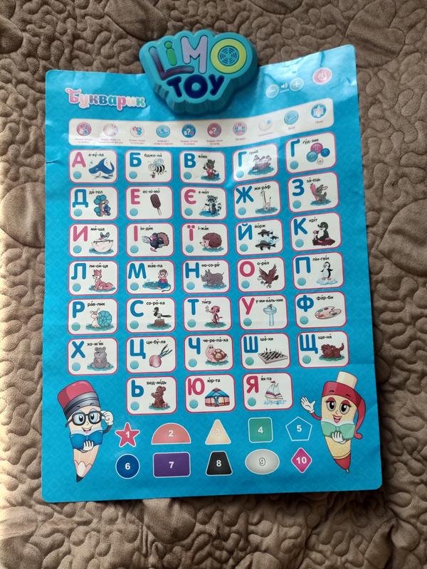 Обучающая и развивающая игрушка поможет Вашему ребенку в игровой форме выучить буквы, новые слова, цифры, цвета, скороговорки и веселую песенку; проведет экзамен и похвастать за успешное выполнение задания. На плакате 7 режимов игры: 1. Изучение алфавита (после нажатия кнопки "Отвещение" звучат буквы алфавита по порядку). 2. Изучение букв и слов (при нажатии на кнопку рядом с буквой произносится название буквы, при повторном нажатии – название предмета или животного). 3. Изучение цифр и цветов (при нажатии на кнопку с цифрой произносится название цифры, при повторном нажатии – название цвета). 4. Испит (после нажатия кнопки "Испит" "Букварка" предлагает найти букву, похвалит за успешное выполнение задания, а после 2-х неправильный ответов переходит к следующей букве). 5. Игра (после нажатия кнопки "Игра" "Букварка" предлагает найти изображение). 6. Давайте споем (после нажатия кнопки "$ споем" звучит веселая песенка). 7. Веселые скороговорки ("Букварен" помогает изучить скороговорки). На этом плакате все голосовые буквы выделены красным цветом, а согласны – синим, что поможет малышу лучше понять и запомнить разделение букв на две группы: голосные и согласные. Игра с "Букварятком" развивает у ребенка память, мышление и внимание. Плакат имеет регулировку громкости, сенсорные кнопки и влагостойкую поверхность. Игрушку можно положить на стол или повесить на стену. Для детей от 3 лет. Сенсорный звуковой плакат. Плакат озвучен на украинском языке. Возможность самостоятельного обучения. Размещение на столе или стене. Имеет сенсорные кнопки, автоматически выключается. Запрограммировано 45 стирок, 3 игры, 43 загадки, 3 скороговорки, веселую песню. 10 режимов: "своим буквы и цифры", "найди слово, цвет", "своим звуки и фигуры", "разгадируем загадки", "учим слова и цвета", "своим скороговорки", "азбука и цифры в стихотворении", "запоминаем стихи "," найди букву, цифру "," поем песню". Развивает: внимание, память, воображение. Для работы требуются 3 батарейки типа ААА (не входят в комплект). Размеры упаковки: 45,5 х21 х4 см. Размер плаката: 41х55 см. Из недостатков-трохи выгорели цвета
