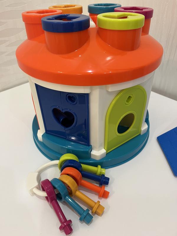 Сортер складається з 12 фігурок різних форм та кольорів. Розвиває дрібну моторику, посидючість та уважність. Допомагає вивчати кольори та форми. Фігурки можна сортувати через отвори на даху або в бічних віконцях. Іграшка в ідеальному стані