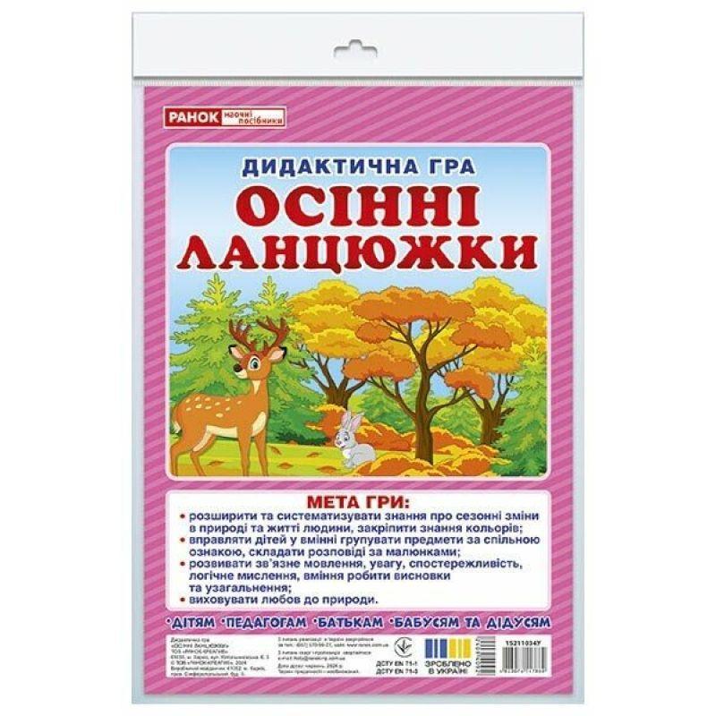 Дидактична гра. Осінні ланцюжки Завдяки дидактичній грі «Осінні ланцюжки» діти навчаться групувати предмети за спільною ознакою, складати розповіді. Гра підходить для роботи під час тематичних тижнів про осінь або для позакласних занять по концепції НУШ. Працювати можна як з групою дітей (початкова школа, дитячий садок), так і індивідуально. У наборі 48 карток, зроблених з целюлозного картону і рекомендації до гри. Гра призначена для багаторазового використання. Як грати: Гра має кілька варіантів. 1. Розкладіть картки перед дітьми. Запропонуйте якусь ознаку, за якою діти повинні вибрати картки. Наприклад: гриби, овочі, що дозрівають восени, тощо. 2. Покладіть перед дітьми картки, об'єднані однією темою. Запропонуйте викласти їх в хронологічному порядку і скласти розповідь. Наприклад: яблуня, яблука в кошику, мама варить компот. Мета гри: - Вивчити сезонні зміни в природі. - Вивчити назви кольорів. - Вчитися групувати предмети за спільною ознакою. - Вчитися складати розповіді. - Розвивати зв'язне мовлення, увагу, спостережливість, логічне мислення, пам'ять. - Виховувати любов до природи. Дидактична гра Ранок Осінні ланцюжки видавництва Ранок можна купити в інтернет-магазині *************** зі знижкою або з безкоштовною доставкою по Україні.