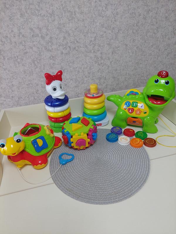 внимание! динозаврик продается отдельно! все остальное в одной лоте! 1. черепашка-сортер каталка. фигурки все подвижные при нажатии кнопочки, не работает музыкальное сопровождение, как каталка и сортер 2. Пирамидка утенка, в хорошем состоянии, почти не играли 3. Пирамидка неваляшка Phiser price, красиво играли, имеют следы использования 4. Сортер конструктор куб, все разбирается, сортируется, в хорошем состоянии цена за 4 игрушки