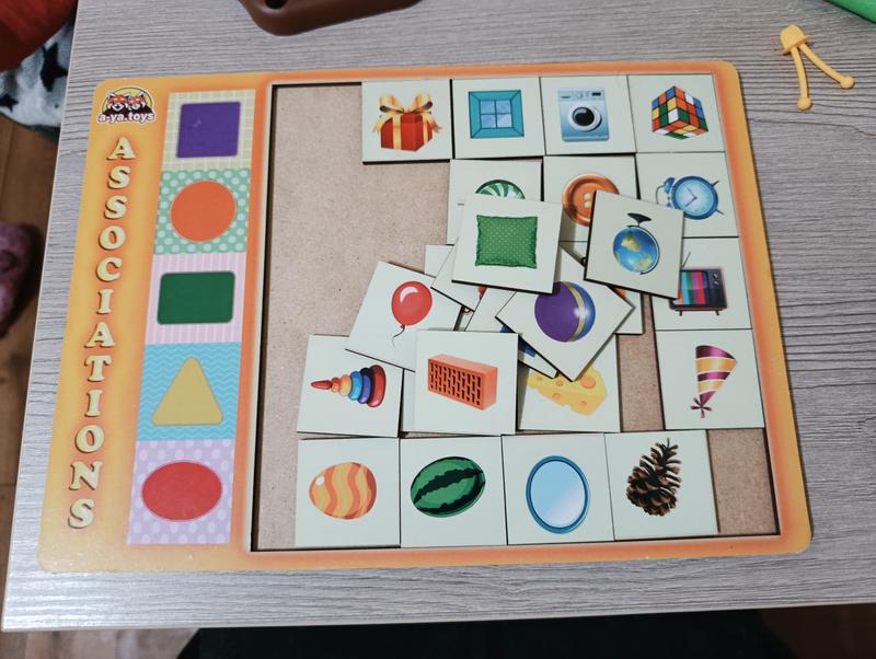 Деревянный планшет-рамка, на котором изображены пять различных геометрических фигур. Необходимо правильно собрать 5 рядов квадратов (25 плашек) с изображением предметов, которые по форме напоминают различные геометрические фигуры.