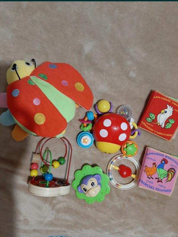 Детские развивающие игрушки,в идеальном состоянии 1. Мягкая развивающая божья коровка; 2. Музыкальная игрушка ползающая Божья коровка; 3.7. Книжка шелестящая; 4. Деревянная игрушка "Лабиринт"; 5.6. Погремушки Цена 200 грн.за все