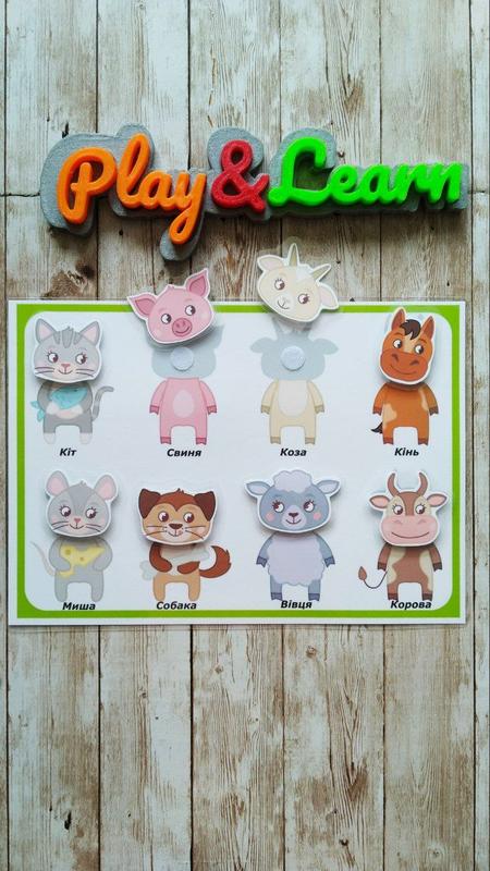Тіньове лото "Де яка тваринка?" Потрібно правильно підібрати голівку тваринці. Свійські та домашні тварини. 8 деталей на липучках.