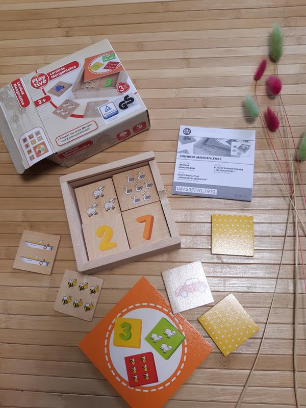 Навчальні скриньки PLAYTIVE® JUNIOR вчимось цифр з коробкою для зберігання властивості Виготовлено з натурального дерева якісно. Набір для навчання рахунку. Сприяє першому розумінню величин і чисел 20 дерев'яних квадратиків, з них 10 - що складаються з числа та відповідної кількості зображення Вікова рекомендація: від 3 років