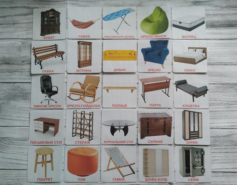 Класичні картки Домана (містять зображення та підпис предмета). В набір входять 30 ламінованих карток із заокругленими краями. Розмір картки: 9,5х9,5 см. Мова: українська.