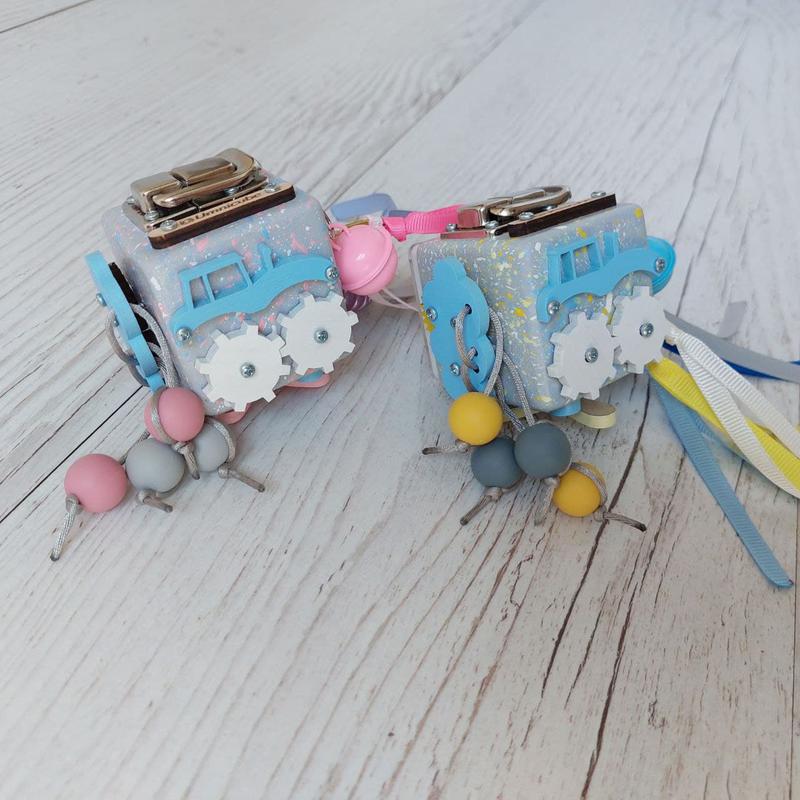 Это один из самых классных и самых сложных в исполнении кубиков, но именно с него мы решили начать. Потому что искренне влюблены в него 😍 Каждая грань кубика представляет из себя развивающую игрушку: 🚜 Симпатичный и весьма изящный трактор с колёсами-шестерёнками, которые так легко крутятся маленькими пальчиками и заинтересуют всех юных исследователей 🌦 Облачко с бусинами, которые интересно перетягивать. Их даже можно грызть, поскольку они сделаны из пищевого силикона, а шнурочки завязаны специальным узлом (по технологии детских грызунков) 🌞 Солнышко за облаком "встаёт и садится", при этом массажируя детские пальчики. А каждый родитель знает, что такой массаж очень и очень важен и полезен 🔥 ✈ Пропеллер из двух элементов легко раскручивается и завораживает кроху практически так же, как винты настоящего самолёта. Ну или потолочного вентилятора 😀 🌆 Окошко с разноцветными камушками - это проявление эстетики в чистом виде 😍 К тому же, интересно как они туда, за стекло, попали и могут ли высыпаться, если окошко переворачивать))) 🔐 Замочек, достаточно большой и удобный, чтобы его было интересно открывать и закрывать 🎗 Ленточки, резинка и цветной бубенчик - эта грань кубика как магнит для всех малышей! Её так интересно перебирать, растягивать и крутить! Кубик действительно очень крутой! Проверено малышами 😍