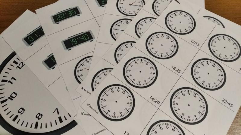 Набір для вивчення годинника. У набір входять: - Ламінований годинник - 16 карток для правильного відображення години (хвилини) - 24 картки для співставлення електронний/механічний годинник (хвилини) - 12 карток для правильного визначення годинника (години) - 36 карток для співставлення електронний/механічний годинник (години)